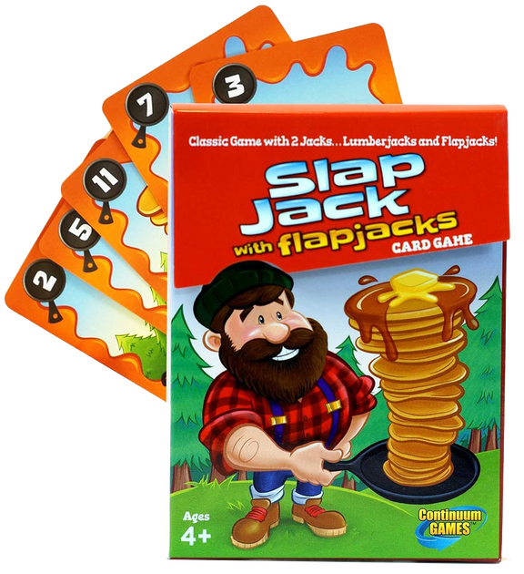 Slap Jack is the classic game of matching, slapping and collecting cards. The fun pancake theme introduces special Lumberjacks and Flapjack cards. Slap Jack with Flap Jacks is a wonderful way for kids to learn how to play cards. Learn how to hold cards, shuffle, deal, take turns and more. Also, learn picture and color matching and how to read numbers. Players: 2 to 6 | Ages: 4